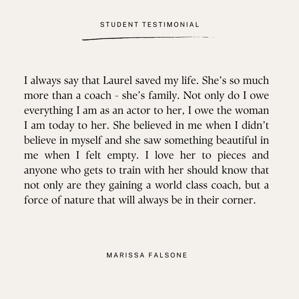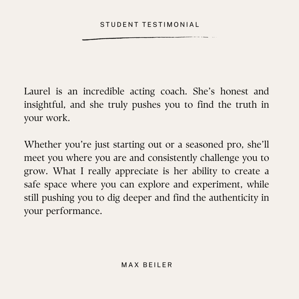 Laurel is, without a doubt, the best acting coach I have ever had. Her wisdom, encouragement, and guidance over the past ten years have been invaluable, and the impact she has had on both my career and personal growth is immeasurable. I am forever grateful.