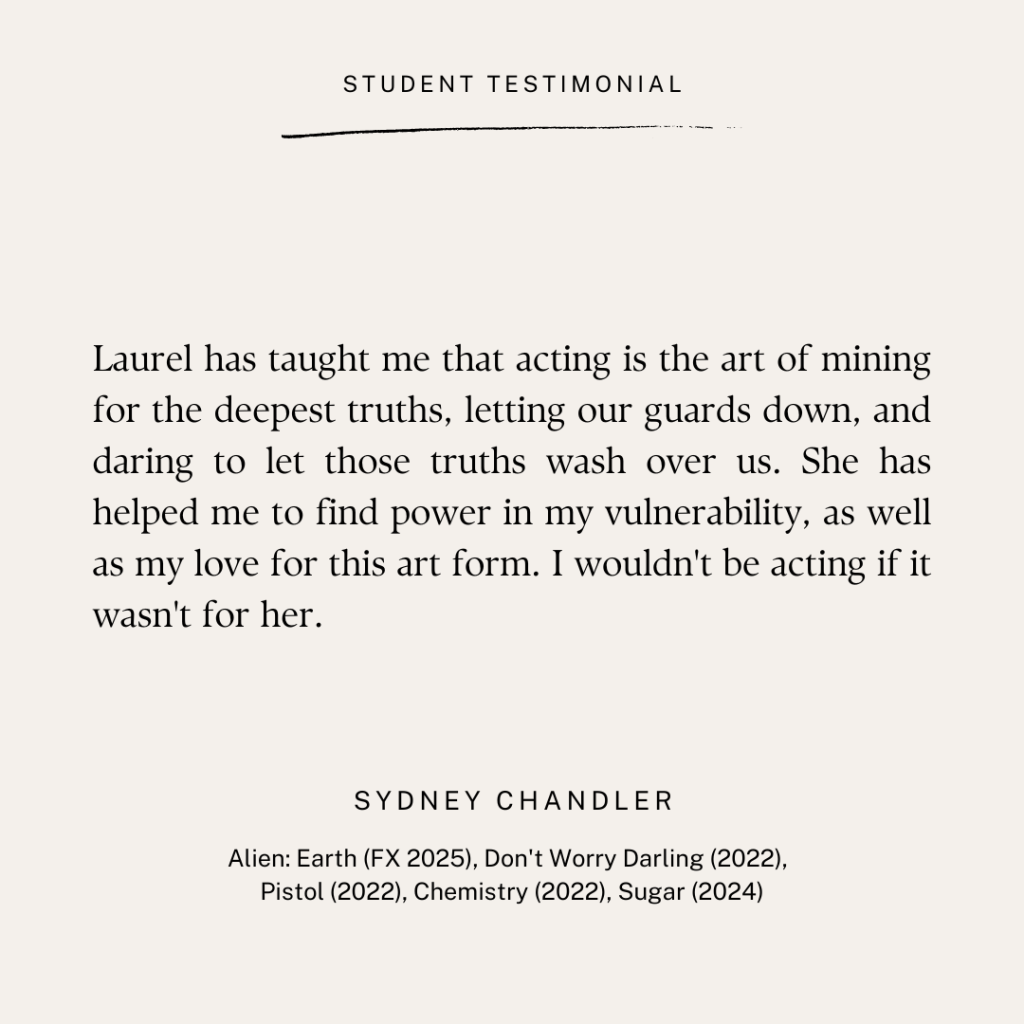 I have always said that Laurel’s classes feel like therapy–she has a unique ability to help you break down walls you didn’t even realize were there. Her approach goes beyond acting; it’s about self-discovery, growth, and unlocking the most honest version of yourself. Her guidance has been life-changing, shaping not just my craft but also my confidence and mindset as an actor.